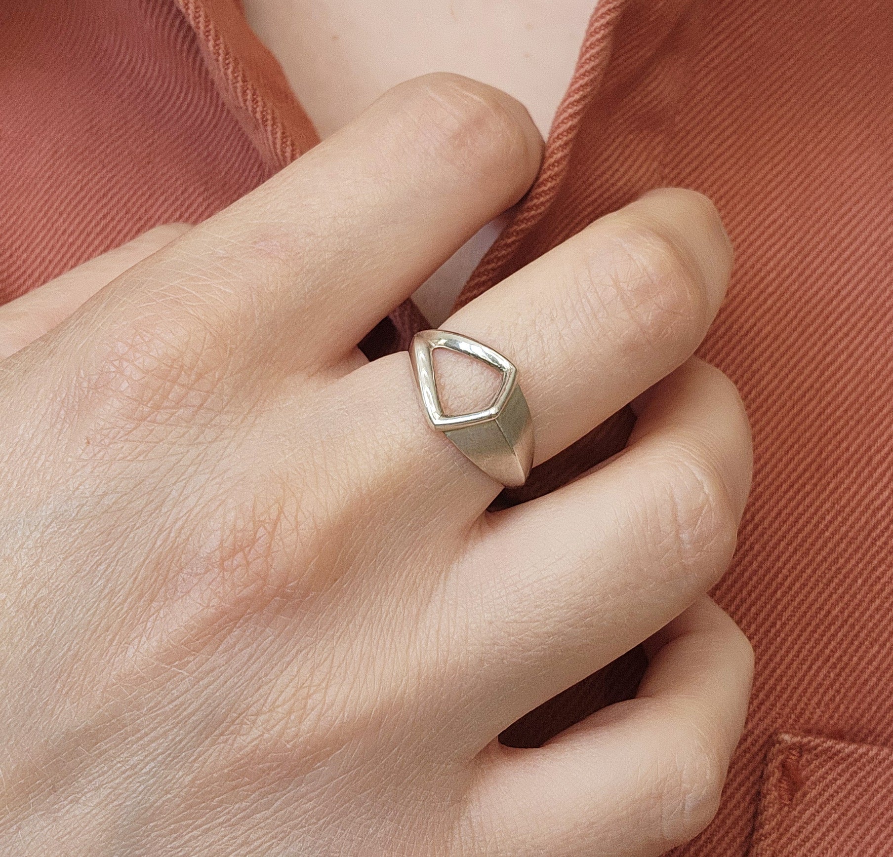 this unique ring features an eye-catching geometric design that adds a modern touch to any ensemble. Whether you're dressing up for a special occasion or adding flair to your everyday look, this ring is the perfect accessory.